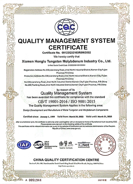 Xiamen Honglu focuses on the development of new tungsten and molybdenum products and exploitation of new applications. Relying on the advantage of Xiamen Tungsten Co., Ltd on complete tungsten processing industry chain of “tungsten mine - smelting - deep processing”, the Company adheres to the market-oriented, quality at its core, technological progress and innovation as the means, standardizes enterprise management, improves enterprise system, carries forward the enterprise spirit of "Unity, Diligence, Innovation, Efficiency, Perseverance" and builds "the international, leading, professional W/Mo and other powder metallurgical products supplier ".