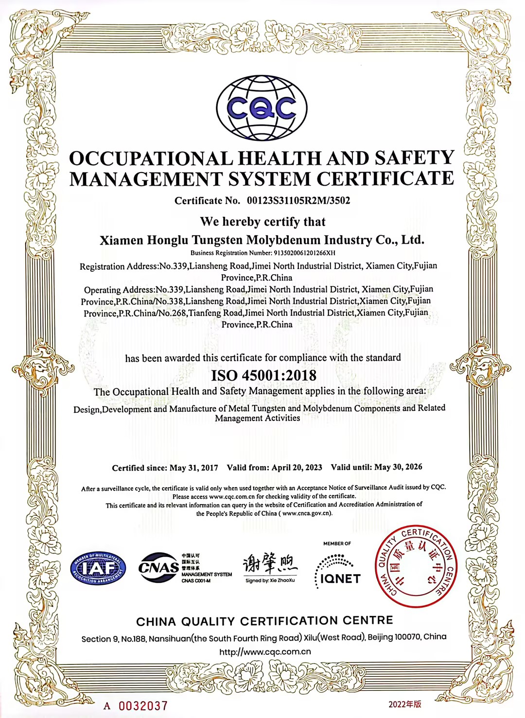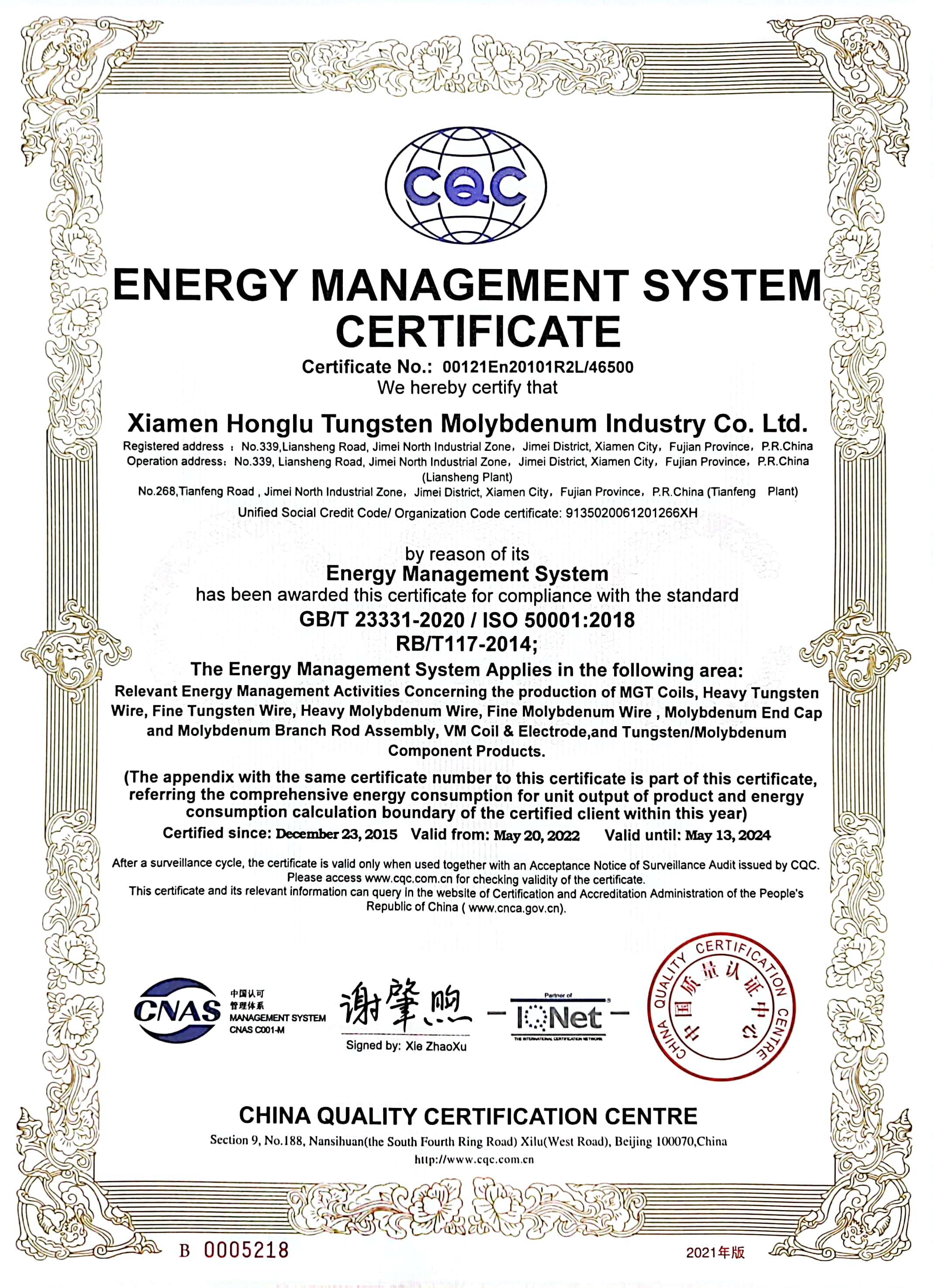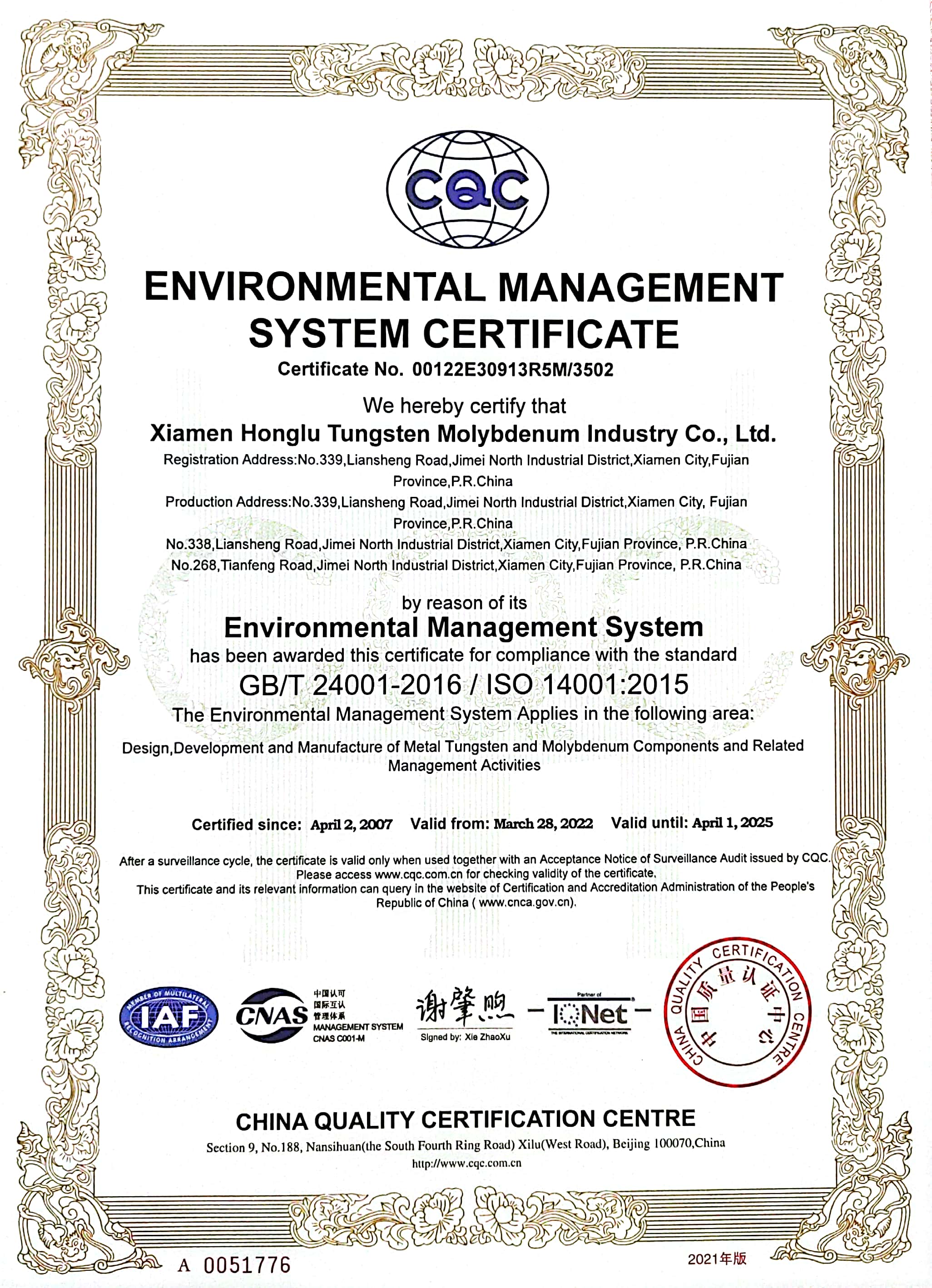 Established in 1992, Xiamen Honglu Tungsten Molybdenum Industry Co., Ltd. with registered capital of RMB 240,670,000 is a state-controlled Sino-Korea joint venture.?The Company is one of the core members of public-listed Xiamen Tungsten Co., Ltd. and is also one of the State New High-Tech Companies in China. The Company has the first “Post Doctoral Programme” in Chinese tungsten and molybdenum processing industry, and also jointly set up the “Rare Metal Processing Laboratory” with Metal Research Institute of Chinese Academy of Sciences.?